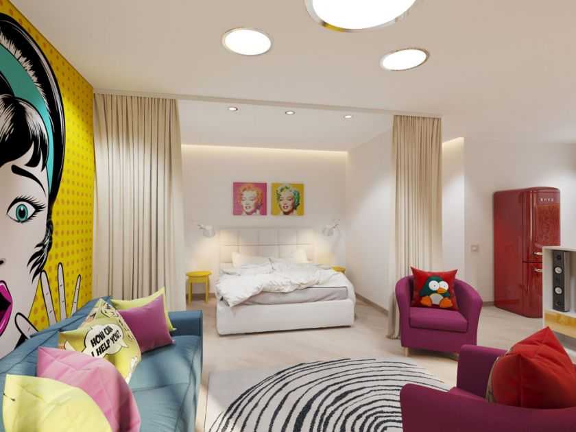 — Декор спальни в стиле поп-арт яркий и позитивный, вызывающий и креативный, не имеющий чётких границ. Поэтому создать его под силу каждому, достаточно проявить фантазию. Для отделки используют искусственные материалы, пластик, синтетику. Такое оформление понравится творческим личностям, ведущим активный образ жизни и любящим современное искусство, культуру, музыку, кино.