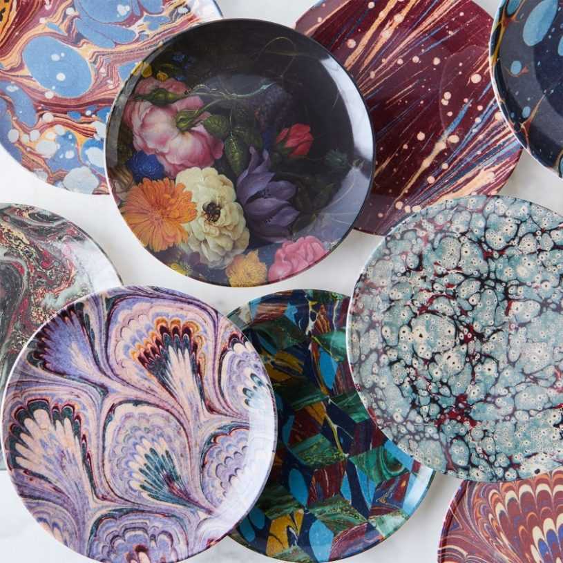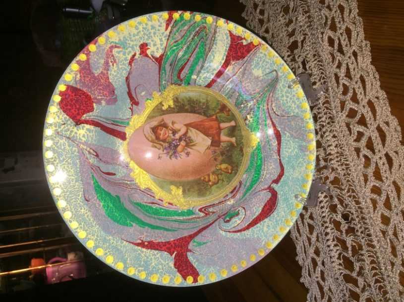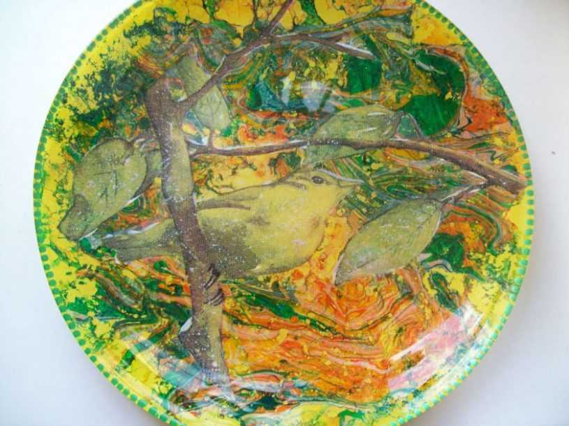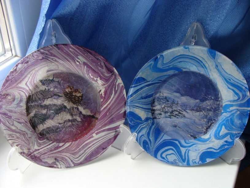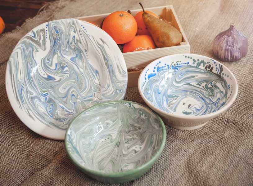 Ещё одна актуальная и необычная техника украшения. Декорировать в ней можно любые тарелки – стеклянные, деревянные, керамические. Для работы в этой технике нужно приобрести специальные краски для марморирования.