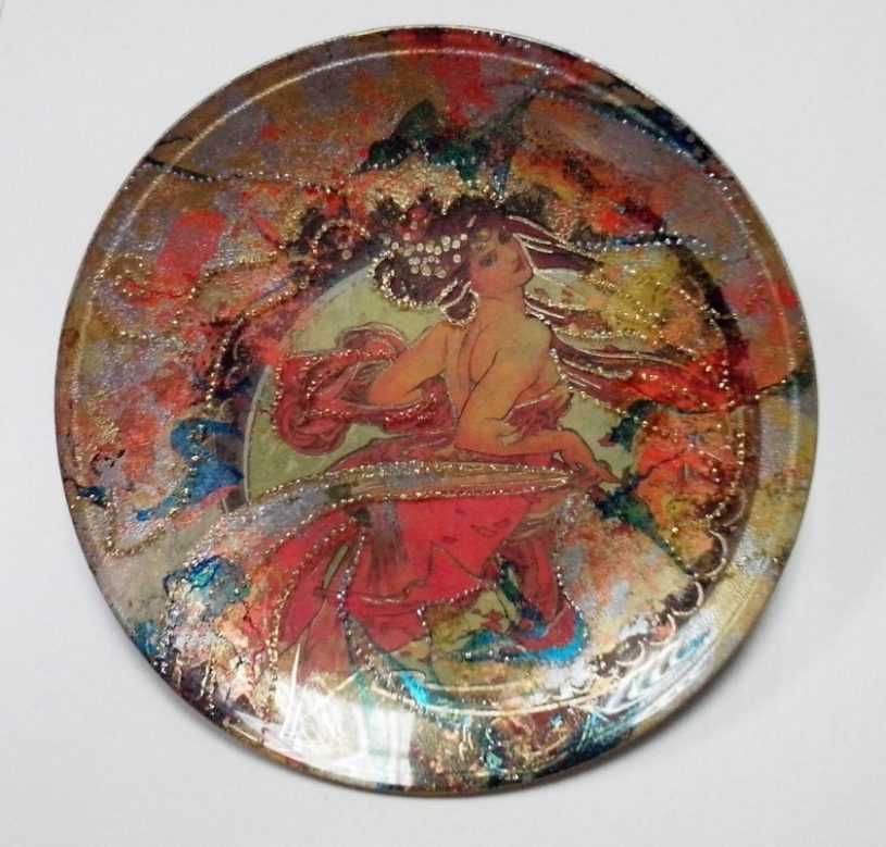 После этого на тарелку равномерно наносят клей. Для этого можно использовать кисточку. Сверху накладывается рисунок и разглаживается. Бумагу с узором либо салфетку следует расправлять аккуратно, при этом не нарушая ее целостности. Сверху наносится еще один слой клеящего вещества.