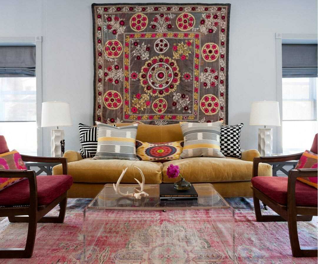 Восток. Визитной карточкой любого восточного интерьера считается именно мягкий тканый ковер, он используется везде — на полу, на стенах, как покрывало, даже как фактура на диванных подушках. Если в вашем доме присутствуют восточные ноты — обилие думок, кальяны, кувшины или вазы с острыми горлышками, балдахины, большое количество текстиля и пр., гобелен идеально впишется в общую картину. К тому же, яркие восточные узоры сейчас в тренде, в конце концов, если кто-то принципиально против ковров, это может быть тематическая вышивка на дивандеках.