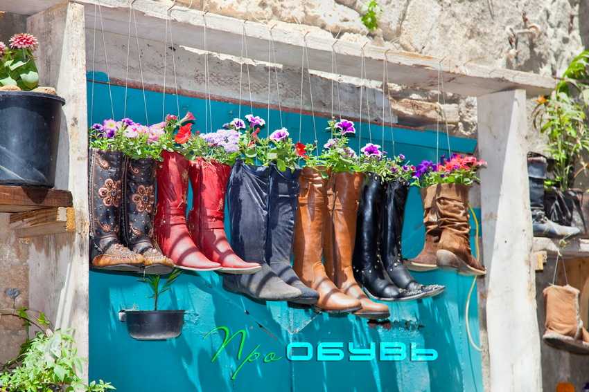 Старая обувь еще может послужить в качестве цветочных горшков и украсить участок
