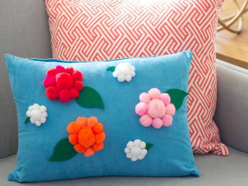 Узор из помпонов на детскую подушку лучше пришивать, а не приклеивать