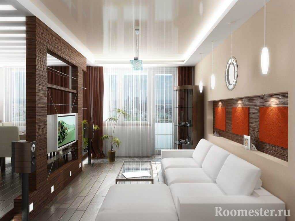 Зону отдыха также не нужно загромождать изобилием мебели, здесь достаточно дивана, пары кресел и журнального столика. Для функциональности пространства можно использовать настенные полки, телевизор также лучше повесить на одну из стен. Если же в гостиной приходится и спать, то лучше всего использовать раскладные модели диванов. Диван лучше всего располагать напротив телевизора таким образом, чтобы он был повернут к кухне спинкой. В качестве занавесок здесь лучше всего использовать прозрачные шторы, тюль или рулонные модели, которыми можно регулировать естественное освещение.