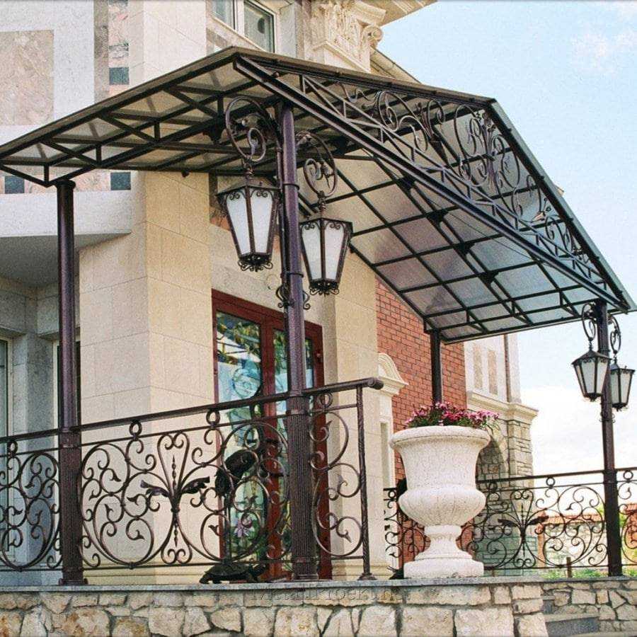 Кованый козырёк стоит дороже, но вид его в разы презентабельнее. Монтаж таких козырьков является ответственным делом, так как нужно быть уверенным, что такая конструкция не рухнет зимой вам на голову.