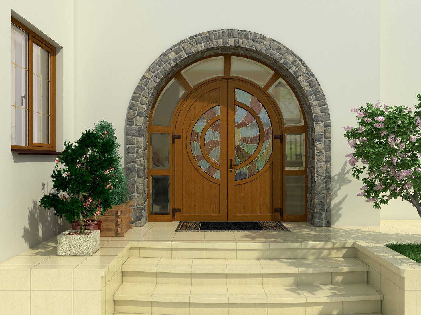Арочный проем, стеклянные вставки на темном фоне дверного каркаса, кованые перила, уличные светильники, стилизованные под фонари – все способно украсить внешний вид здания в целом и крыльца в частности.