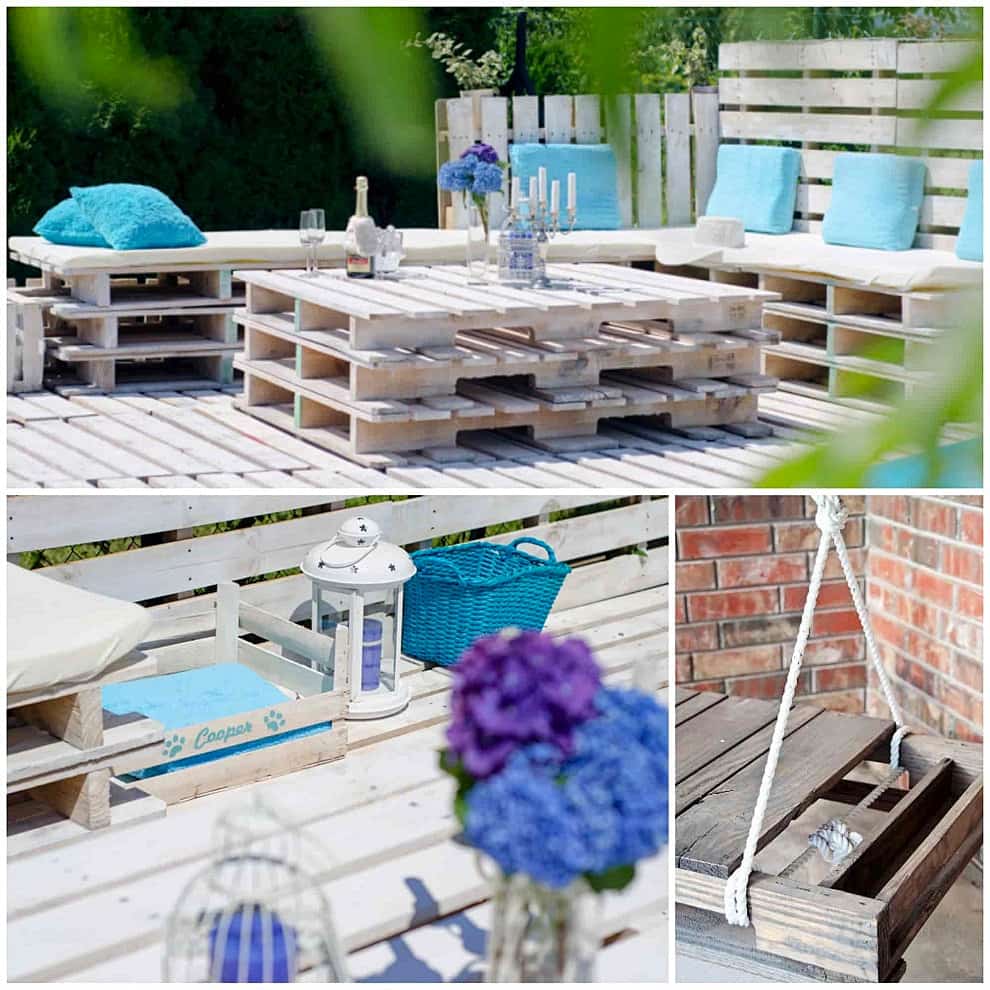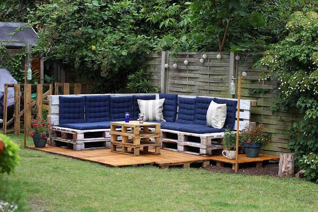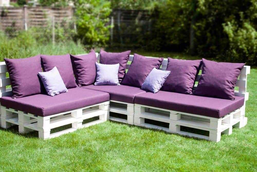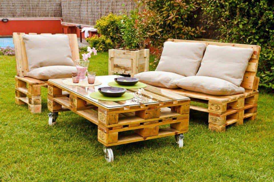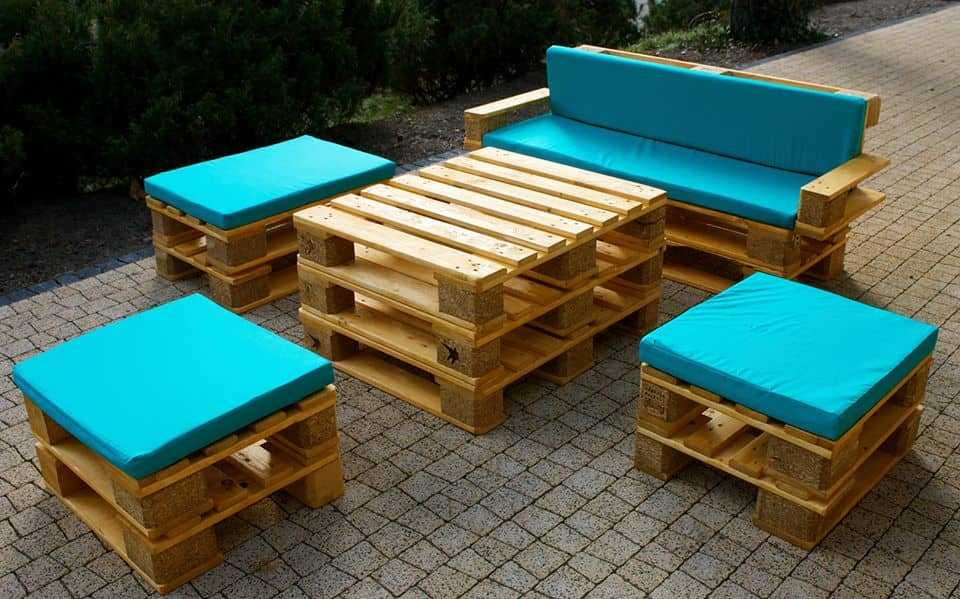 Изготовить легкие и стильные предметы можно при помощи досок, бревен и пней. Достаточно привлекательный вариант – мебель из ротанга, дополненная мягкими подушками. В последнее время популярно сооружение мебели из паллета (деревянных поддонов), которые можно найти в строительном магазине. С их помощью легко создать стильную и необычную мебель, главное обработать древесину, защитив ее от насекомых и влаги.