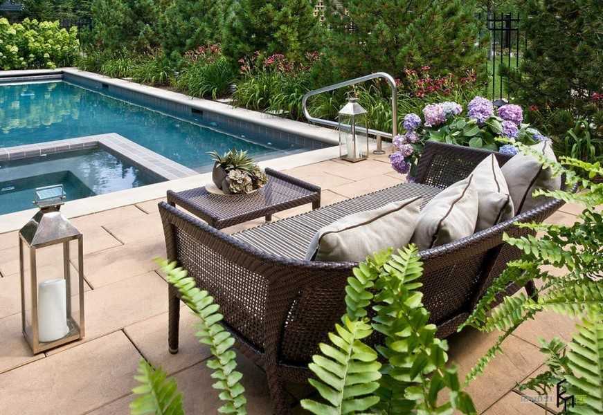 Для удобства устанавливают массивный стол, удобные скамейки. Дополняют такой уголок шезлонгами, гамаками. Хорошим решением будет обустройство навеса, защищающего от дождей.