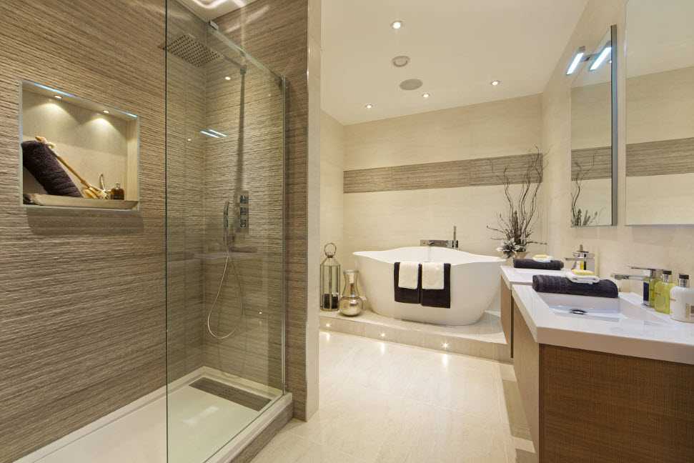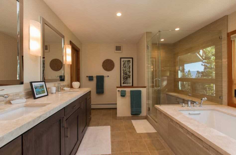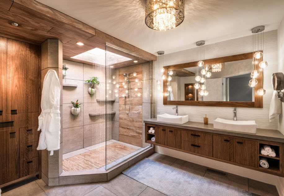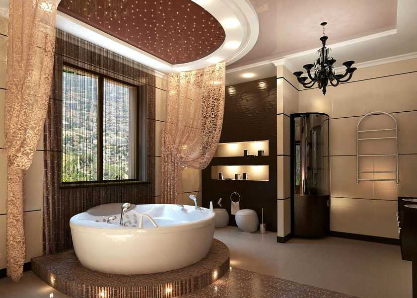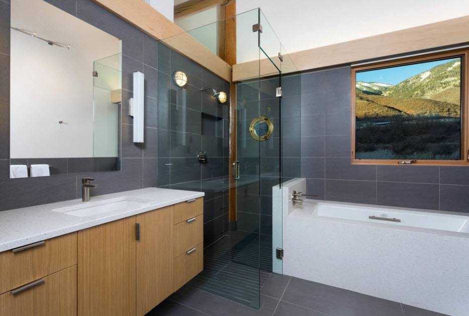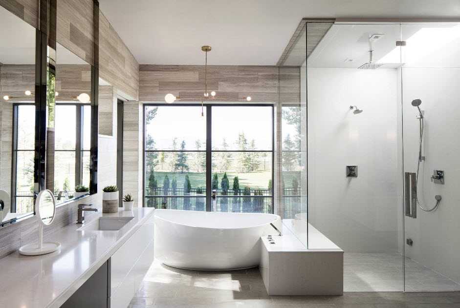 Интересный дизайн ванной комнаты с душевой кабиной и ванной