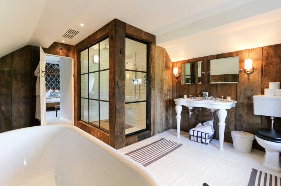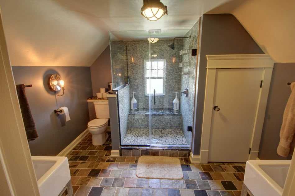 - Лофт. Для создания интерьера в этом стиле необходимо много свободного пространства. Но в маленьких помещениях его также можно применять, используя больше светлых тонов. Для отделки годится белая кафельная плитка или краска пастельных тонов. Перегородки душевой кабины желательно делать прозрачными — это зрительно расширяет пространство. Для создания уюта возможны акценты в теплых тонах — коричневом, древесном. Должно быть мягкое освещение.