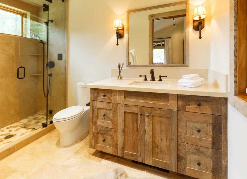 - Кантри. Здесь можно дать волю фантазии: в душевой кабине выложить плитку, а вне душа использовать другой материал. Подойдет дерево (при использовании защитных средств от влаги) или его имитация. Можно выделить тематическими деталями: краном, раковиной, зеркалами, светильниками, картинами с изображениями. Фон должен быть однотонным, чтобы они лучше были видны.