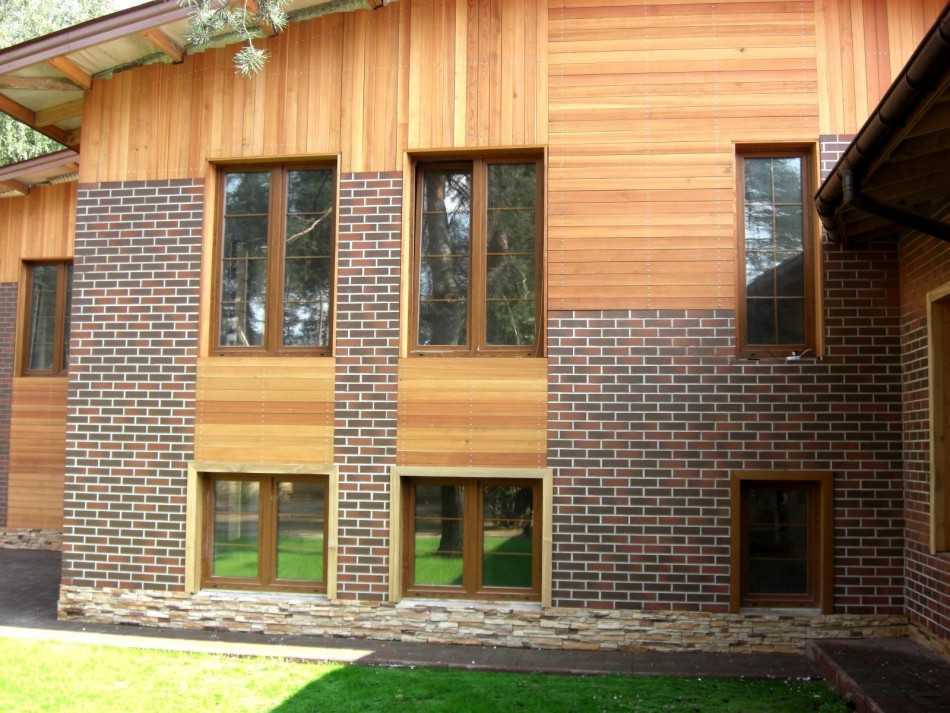 Кирпичная облицовка – очень красивый вариант отделки фасада частного дома, придает дому добротный и респектабельный вид. Достаточно трудоемка, не делается без утолщения или усиления фундамента здания.