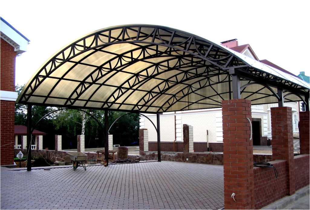 В последнее время актуальны арочные конструкции, обычно, это навес из поликарбоната, пристроенный к дому, на металлическом каркасе. Строения приобрели популярность вследствие невысокой цены, легкости монтажа и некой изящности, благодаря материалам. Они не загромождают архитектурный ансамбль и являются практичной, надежной защитой от атмосферных сюрпризов.