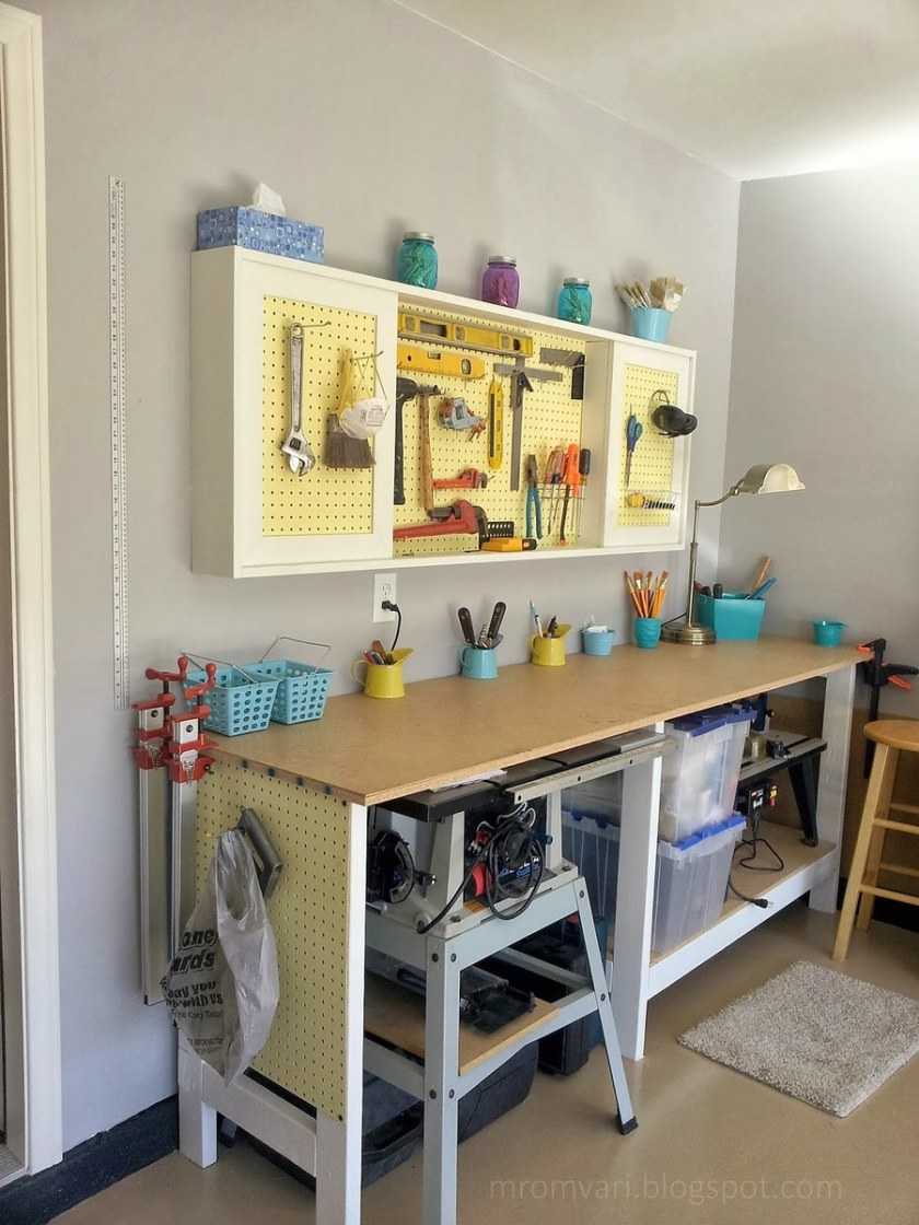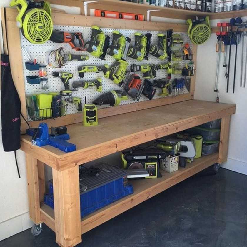 Идея: если гараж совсем маленький, можно потрудиться и сделать раскладной верстак — заднюю его часть прикрепить к стене, и при необходимости опускать столешницу, чтобы освободить место для машины.