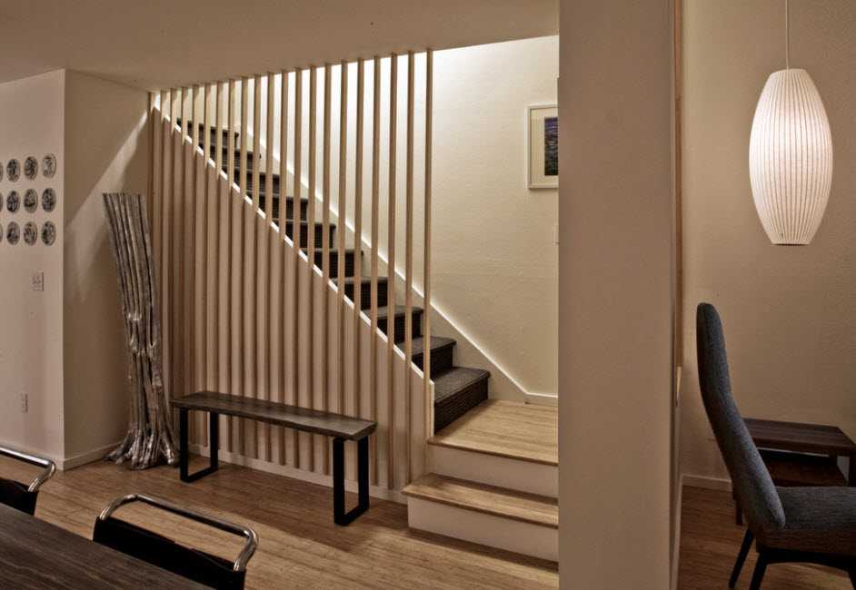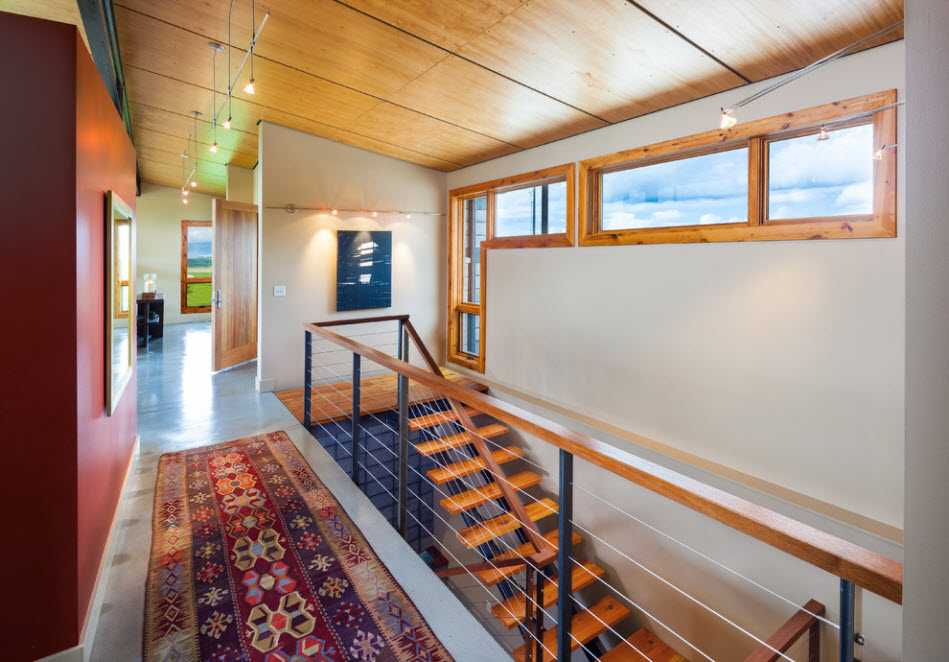 Популярны строгие формы и минимальный декор. Также допустимо его полное отсутствие. Чтобы сделать лестницу в таком стиле, используют древесину, металл, бетон и стекло. Если конструкция выкована, в качестве ограждения подойдут украшения, но лучше придерживаться минимализма. Конструкция лестницы при этом может быть любая. Главное — четкие линие и отсутствие лишних элементов. Если выбран винтовой подъем, он не должен выглядеть слишком витиеватым.