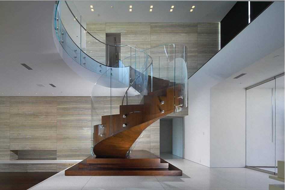 Закрученный подъем в роскошных частных домах зачастую выполняет эстетическую функцию. Возле него эффектно смотрится оригинальная консоль с живыми цветами или растениями. В квартирах такая лестница экономит пространство, а под ней можно организовать дополнительные места хранения.