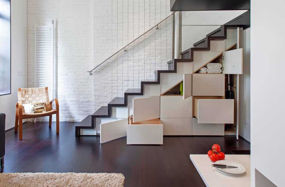 - Лестница в небольшую комнату должна быть практичной: закрытая боковая часть конструкции может быть оборудована встроенной бытовой техникой.