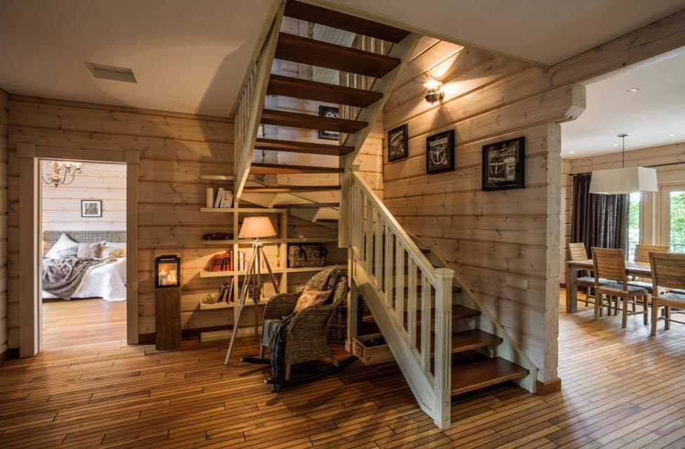Конструкцию из дерева лучше всего использовать в домах, выполненных в стиле русской избы, кантри или прованса. Для лестницы могут использоваться не только дорогие породы дуба, но и самые простая древесина. Оптимальные материалы: ясень, клен, орех и бук. Сосна отличается своей ценовой доступностью, однако ее лучше не использовать, так как это мягкая порода древесины, что очень чувствительна к внешнему воздействию.