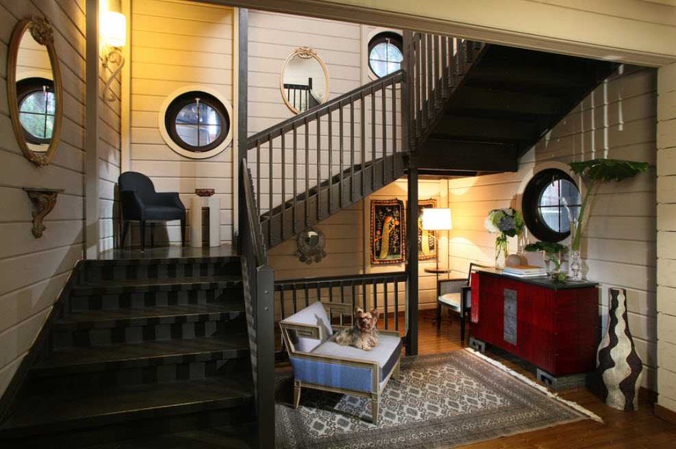 Лестницу размещают гостиной при отсутствии в доме подходящих по размерам коридора или прихожей. Кроме того, лестница в зале – это классический вариант для двухъярусных квартир.