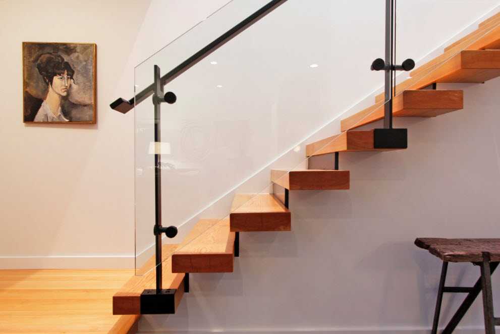 Если вы мечтаете создать легкую приятную атмосферу, отдавайте предпочтение стеклянным ступеням, которые будут дополнять деревянные перила и металлические балясины. Такое вариант – идеальное решение для современного стиля, хай-тек.