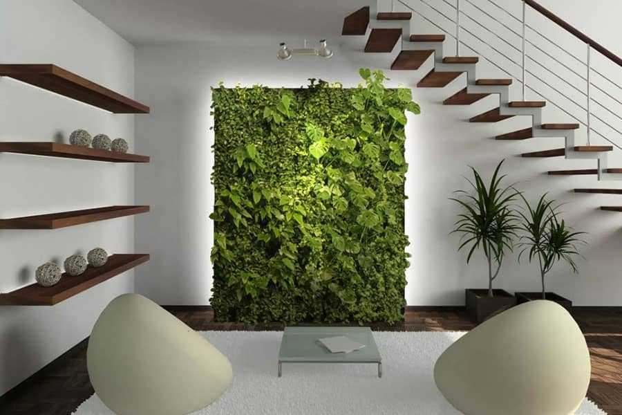 Наиболее простым решением служат настенные бра. Изысканную атмосферу создает светодиодная лента, закрепленная снизу на лестничную конструкцию. Поставив напольную вазу с большим цветком и подсветив его снизу, можно добиться ощущения целых зарослей, в которых приятно посидеть в удобном кресле и отдохнуть.