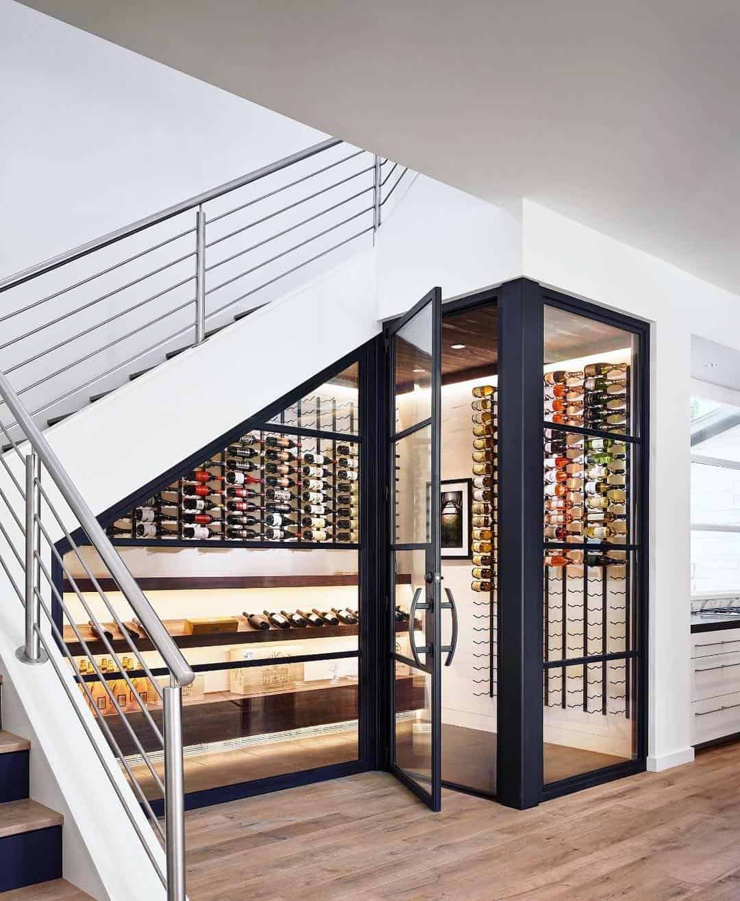 Великолепно размещаются в подлестничном пространстве полки с коллекционными винами за стеклянными фасадами. Если площадь позволяет установите барную стойку с высокими стульями, проведите подсветку с приглушенным освещением.