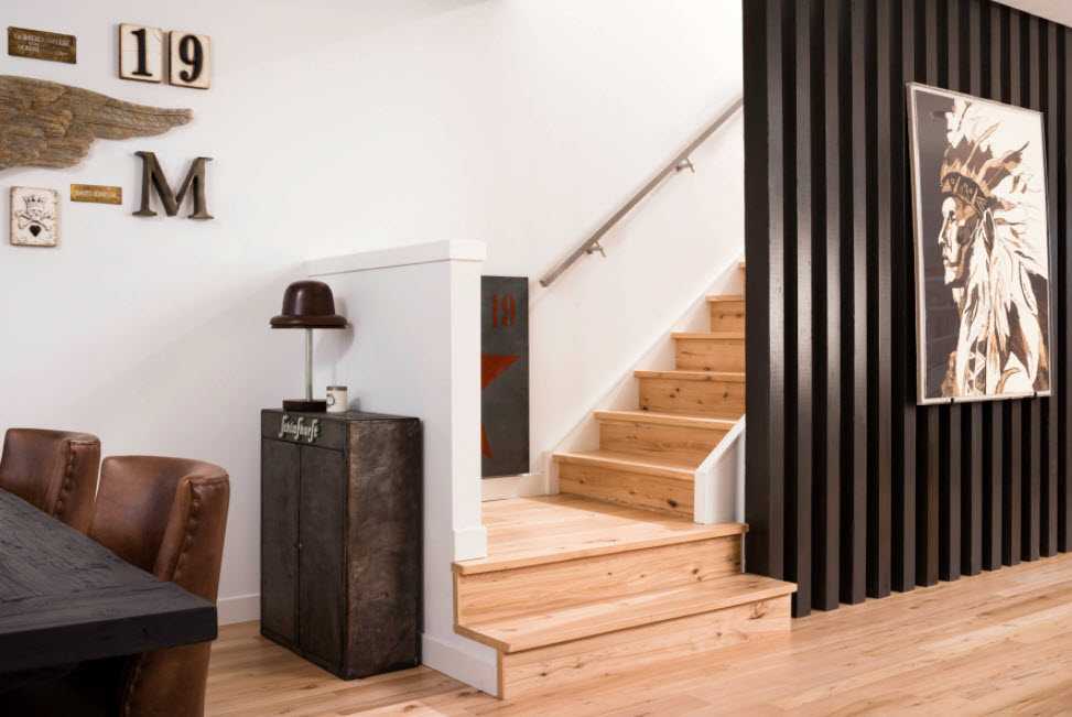 Стиль пришел к нам из Америки. Он подчеркивает деревенскую атмосферу. Чтобы сделать подъем в традициях кантри, используют дерево. Конструкция не должна быть слишком ровной, поэтому создаются потертости и неровности. Цвета при этом должны быть спокойные. Лучше использовать натуральные оттенки древесины. Лестничный пролет можно декорировать тематическими панно.