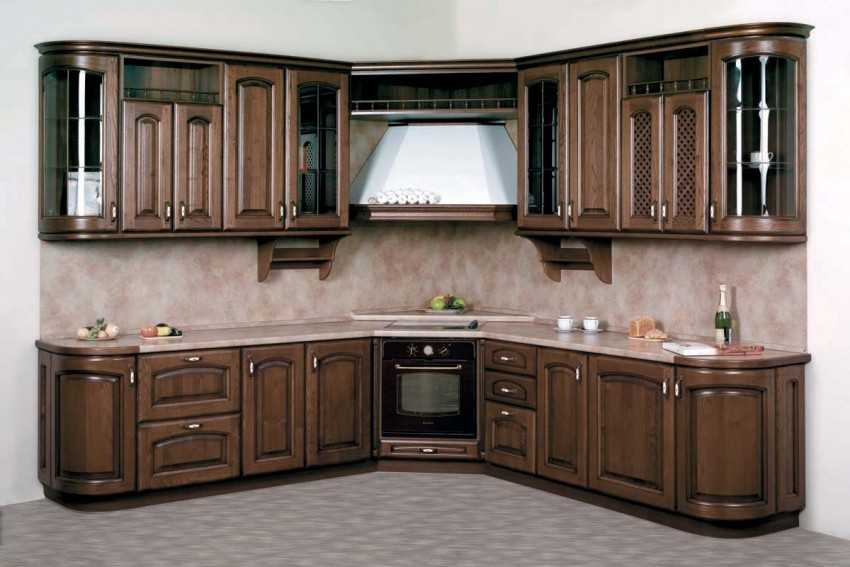Не дешевая древесина будет подчеркнута комбинацией с ламинатом и плинтусами. Гарнитур требует светлый фон и керамический фартук.