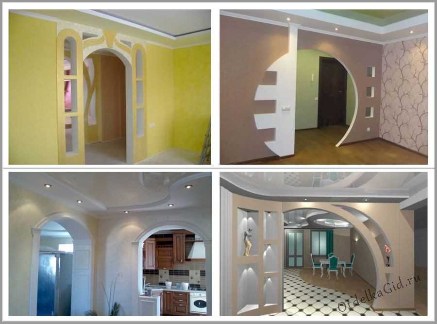 Перегородка может иметь различную конфигурацию. Основным декоративным элементом здесь служит дверной проем, который чаще всего оставляется полностью открытым. Для придания изюминки его выполняют в виде арки или полуарки (можно увидеть на фото). Учитывается, что полукруглые элементы не обязательно размещать по центру перегородки из ГКЛ, они могут располагаться с одного или двух краев.