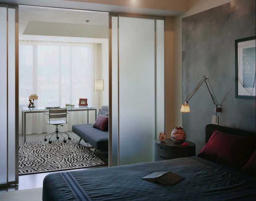 - Закрытые варианты в интерьере небольшой комнаты разбивают пространство не более чем на половину, и занимают лишь часть зоны, не являясь полноценной стеной.