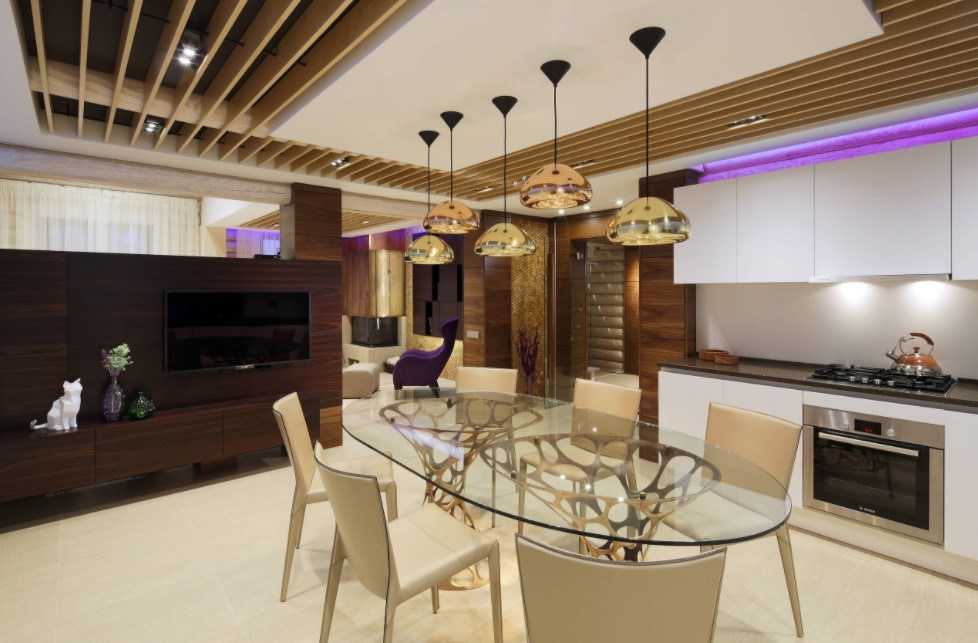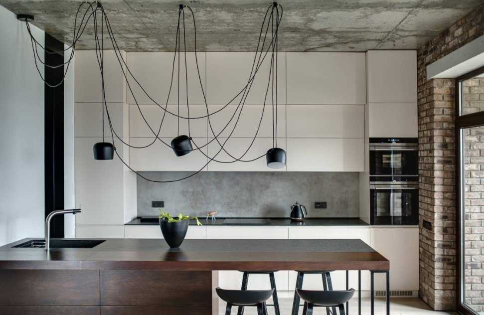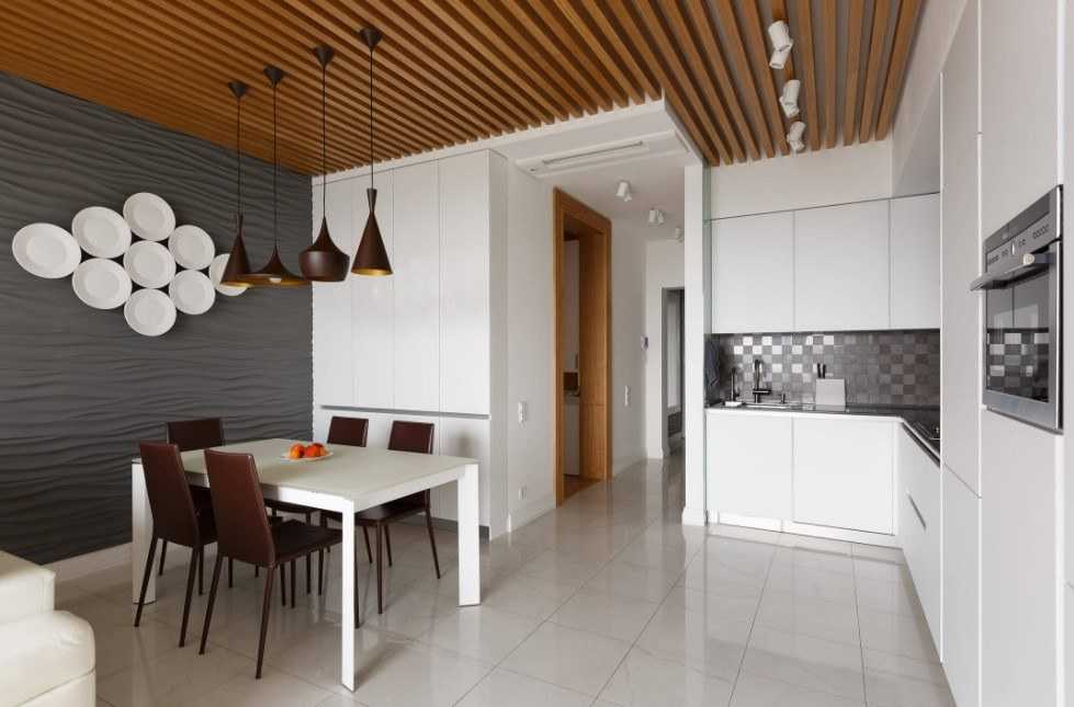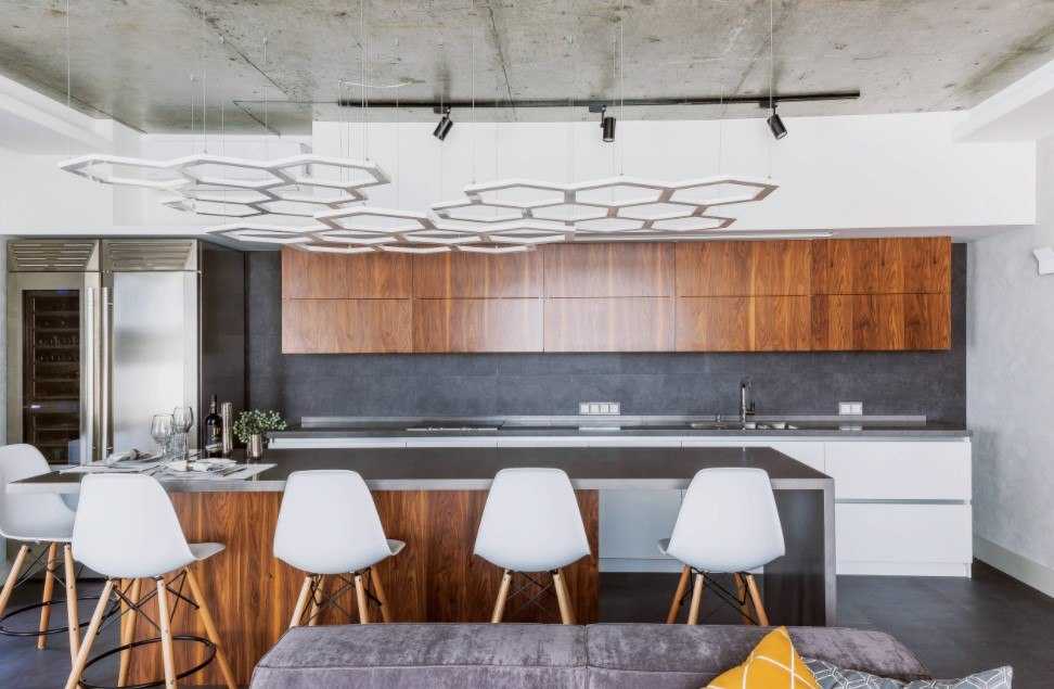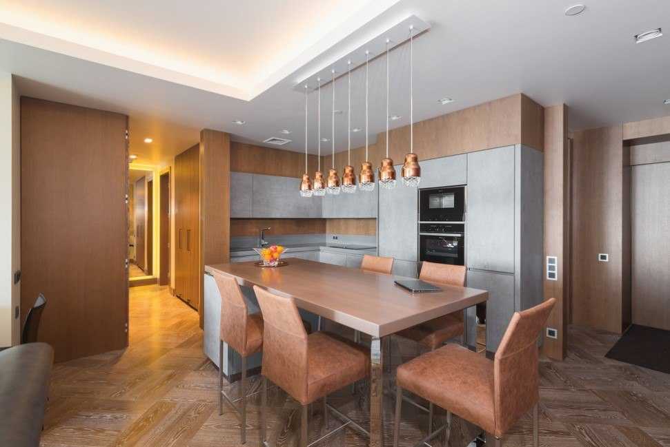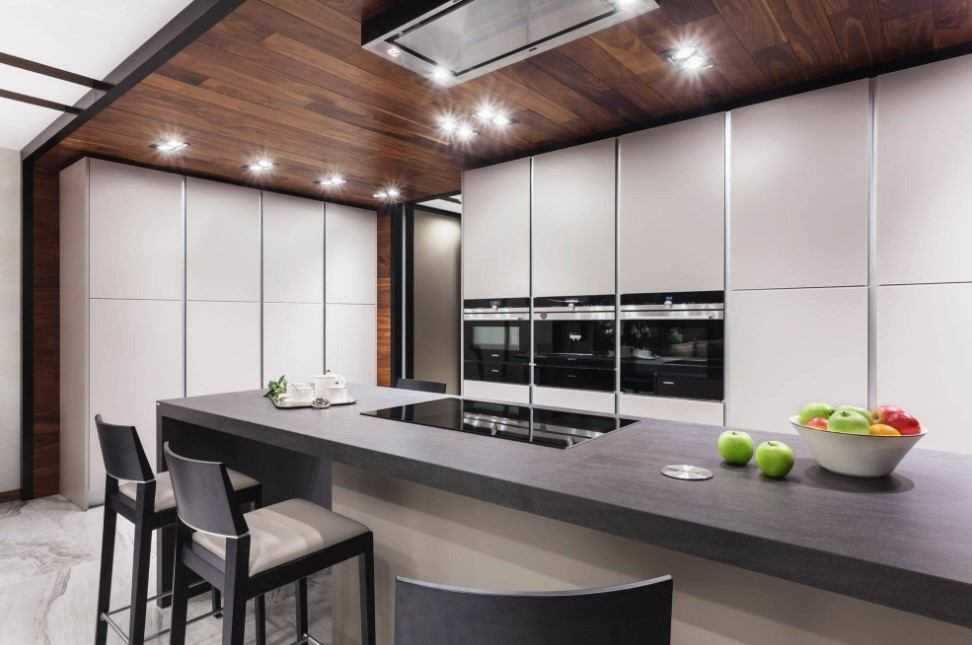 Парящая линия на потолке в интерьере кухни выглядит стильно