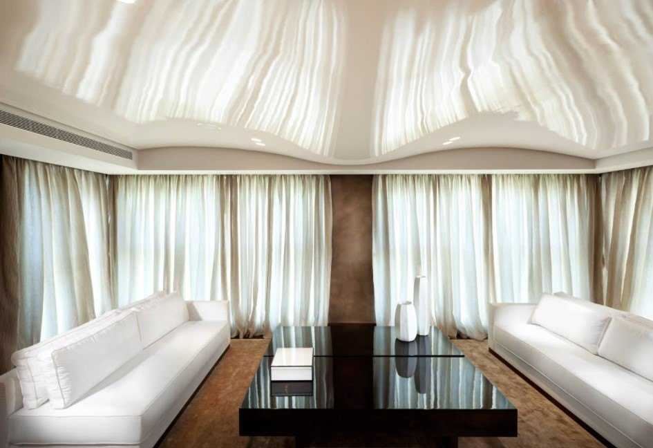 Самая дорогая, но безгранично выигрышная и красивая фактура, которую можно смело рекомендовать, если вы задались целью создать стильный благородный интерьер. Особенно в случае грандиозных планов по использованию комбинированных источников света. На то, как сатиновые потолки умело обращаются со светом, можно без устали смотреть часами.