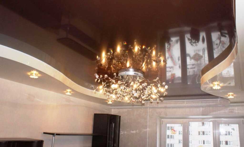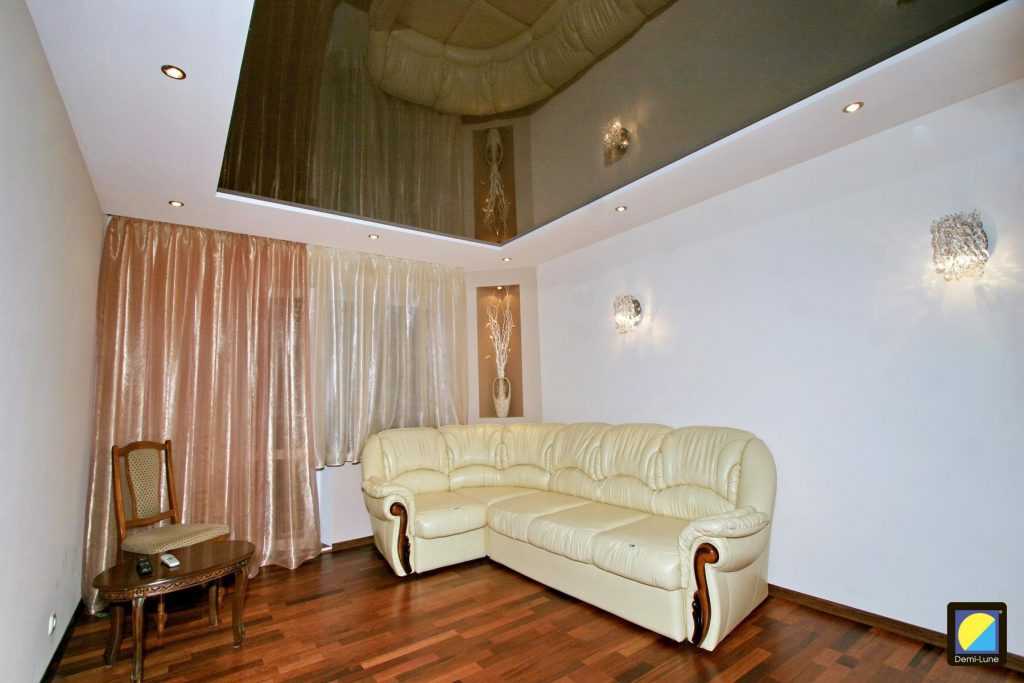 Примеры удачного использования глянцевых натяжных потолков в зале с люстрой и светильниками — на фото ниже.