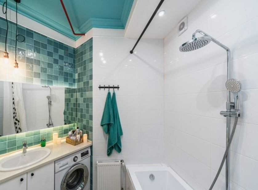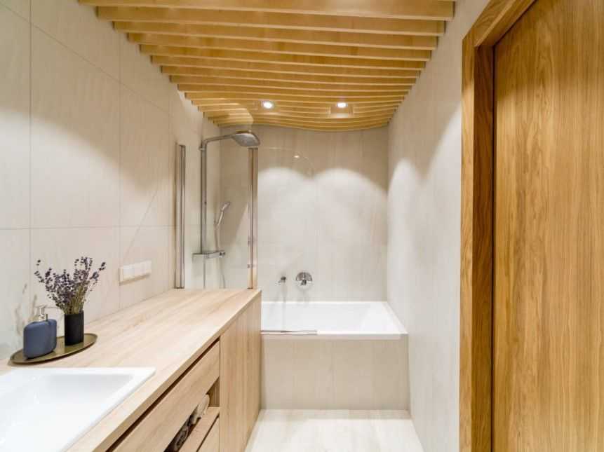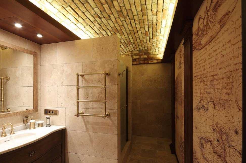 В таком интерьере необходимо соблюдать баланс, не включать большое количество элементов с металлическим отблеском. Хорошо гармонирует подобный потолок с глянцевой плиткой, стеклом с затемненными поверхностями.