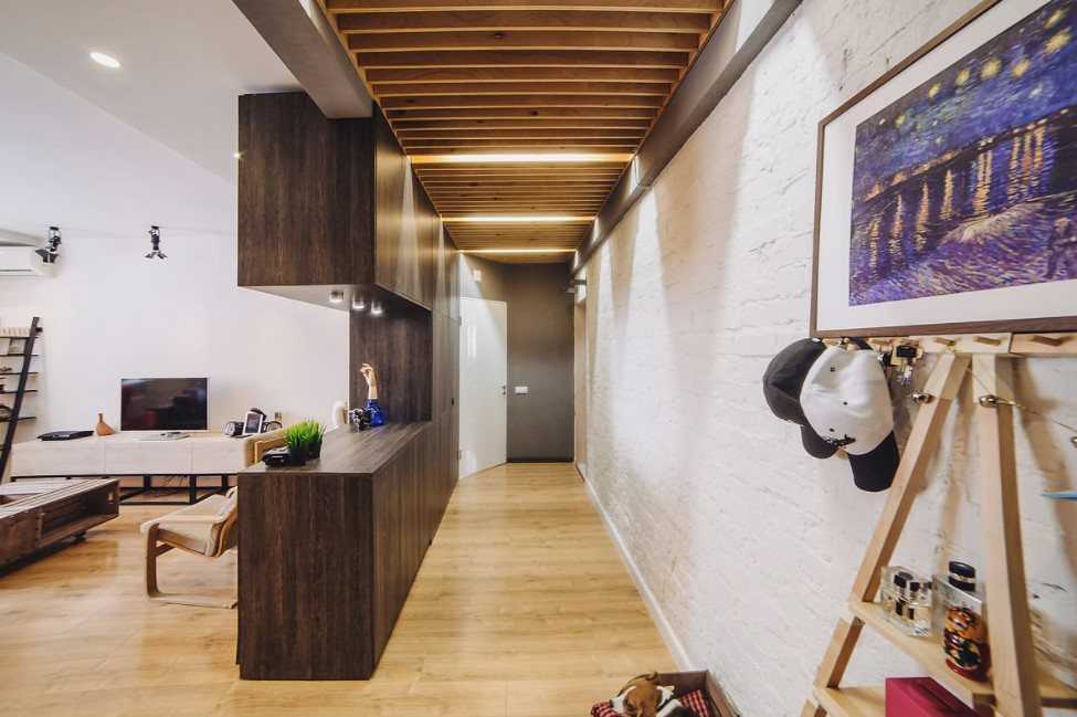 Добрый день, Сергей! Вот простое готовое и не дорогое решение. Это на моем объекте, немного не доделано ещё, но принцип понятен. Очистили потолок от налипшей грязи, широкую щель между плитами замазали штукатуркой (чтобы не осыпалась изнутри крошка), по периметру полиуретановый карниз со светодиодной подсветкой, на стене реальный кирпич, немного подтонированный. Все покрыто прозрачным лаком.