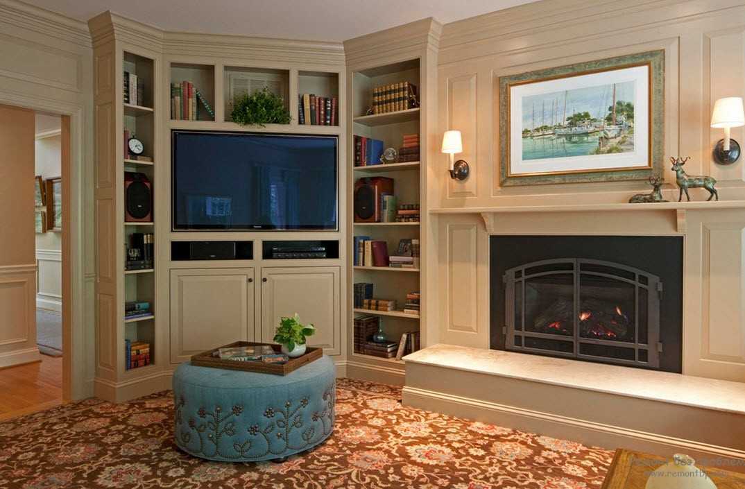 Второй вариант расположения, наоборот, асимметричный. В этом случае камин располагают внизу, но в стороне от телевизора. Подходит для современных интерьеров, так как классические стили предполагают строгость.