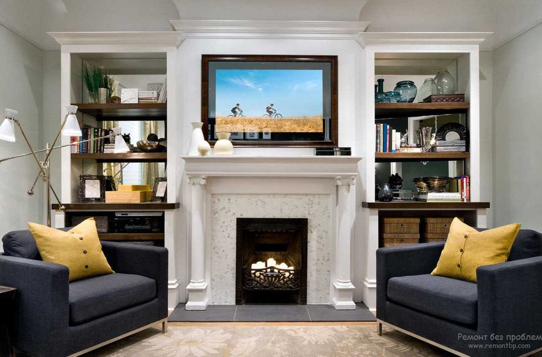 Основных композиционных решений для ТВ-зоны существует два. Первый — симметричный, когда телевизор находятся на одной оси с камином, строго над ним. Подходит для интерьеров в любом стиле.