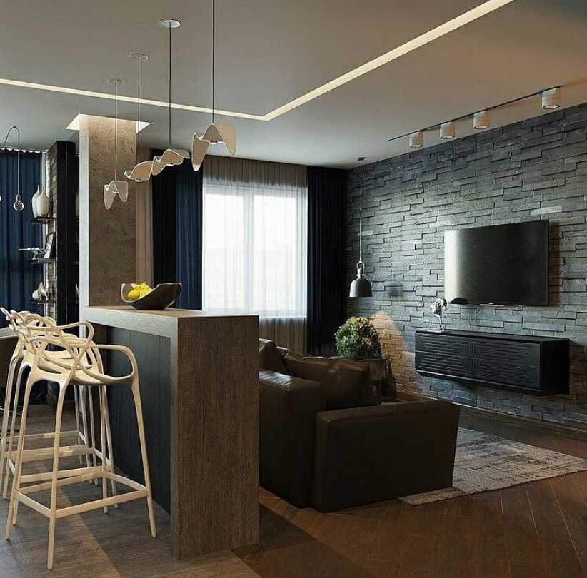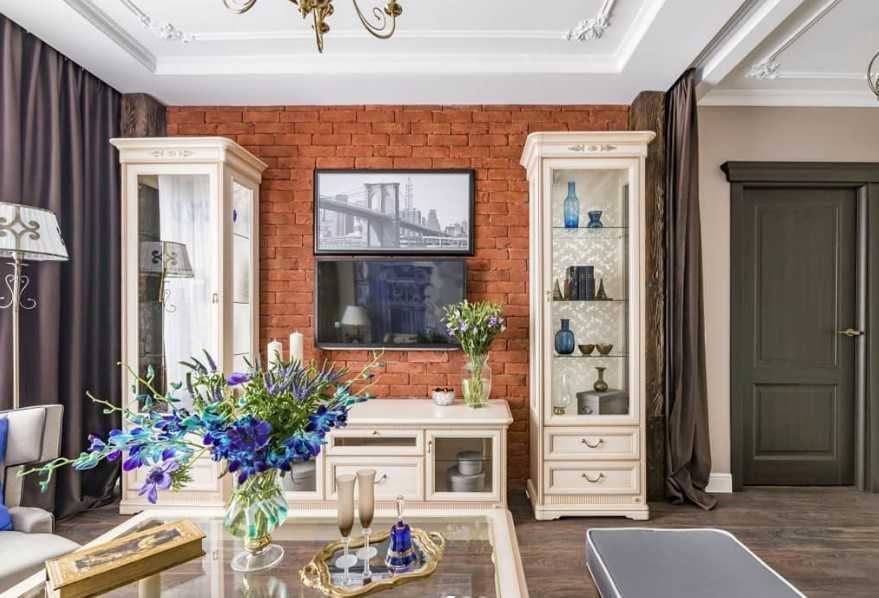 - Имитация кирпича. Практически в любом строительном магазине можно приобрести обои с имитацией кирпича. Долгое время считалось, что такие обои будут уместны только для офисов, так как они не создают ощущение уюта. 2018 год рушит эти стереотипы! Если в соответствующем стиле оформить весь зал, то можно создать по-домашнему теплую атмосферу.