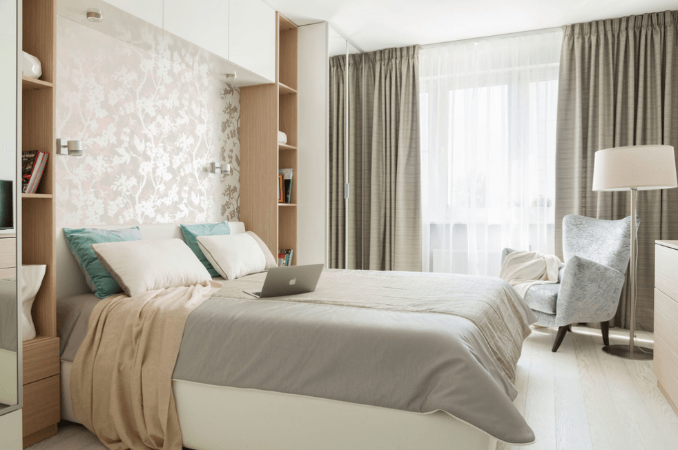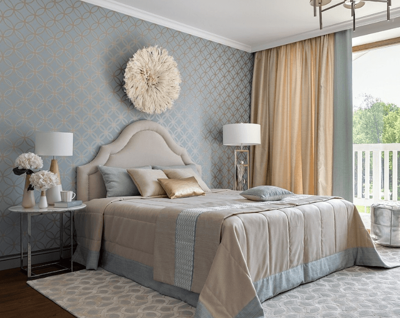 Также будут актуальным сочетание обоев разных оттенков. Это позволяет зрительно разделить комнату и выгодно расставить акценты. При желании можно комбинировать обои с разными принтами. Но делать это нужно только с помощью дизайнера, чтобы сочетание было действительно хорошее и подходило для вашей спальни.
