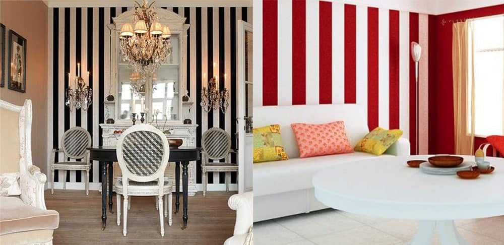 Одним из примеров геометрических обоев являются обои в полоску. Чаще всего таким образом оформляют стену за изголовьем кровати, используя вертикальное расположение полос. При этом комната кажется оптически выше, что особенно полезно в случае высоких подголовников. Горизонтальное расположение полос, в свою очередь, делает комнату шире. Этот узор лучше всего подходит в качестве обоев для детской комнаты, которая обычно намного меньше других комнат в доме. Полосатые обои могут быть: