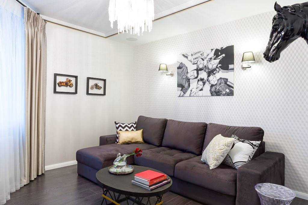 Если гостиная небольшая, то вполне можно визуально увеличить ее пространство, наклеив на одну или две стены фотообои. Их сюжетное наполнение может быть выбрано в зависимости от желания хозяев квартиры. Благодаря большому ассортименту вариантов этой отделки, ее можно подобрать под любое интерьерное решение и создать в гостиной особое настроение, которое будет способствовать активному отдыху или же спокойной релаксации.