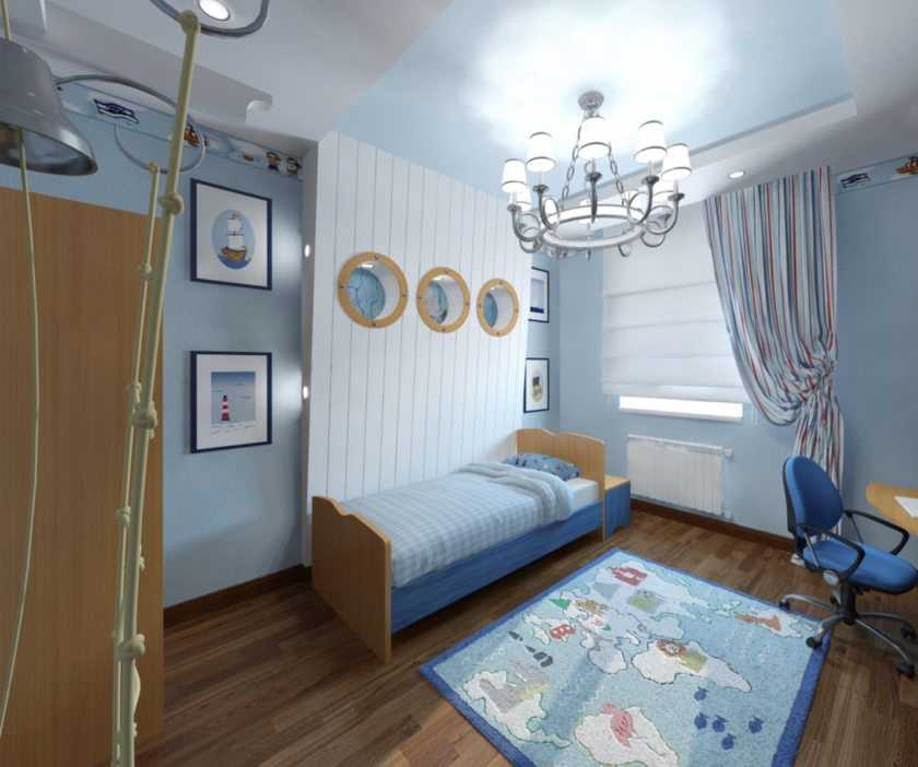 Для детской оформленной в холодных тонах подойдет теплое белое освещение