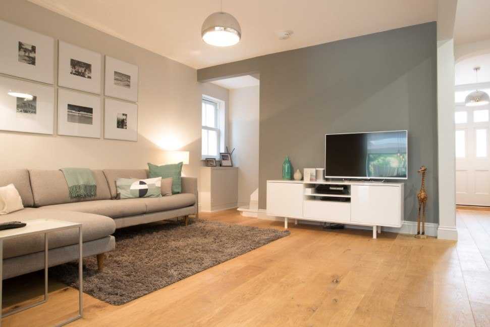 Традиционный угловой диван с серой обивкой в интерьере светлой гостиной