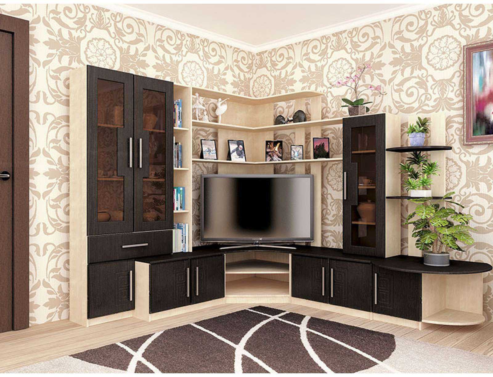 Угловая витрина в интерьере гостиной