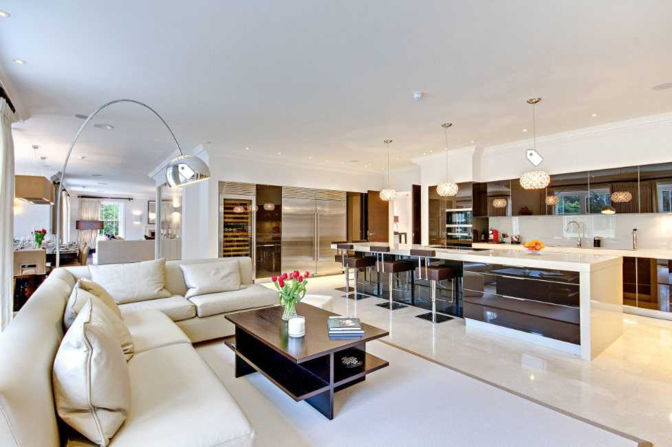 Интерьер гостиной с угловым диваном большого размера будет достаточно красивым. Преимуществом размещения такого большого дивана будет возможность комфортно разместить на нем много людей.