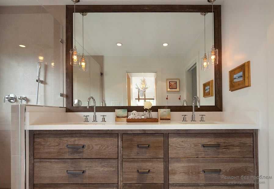 Относительно аксессуаров из дерева для ванной комнаты, хочется особо отметить размещение картины, заключенной в деревянную раму. Подобный дизайнерский ход не всем придется по душе, т.к. является достаточно смелым, но вместе с тем, бесспорно, оригинальным в плане оформления интерьера.