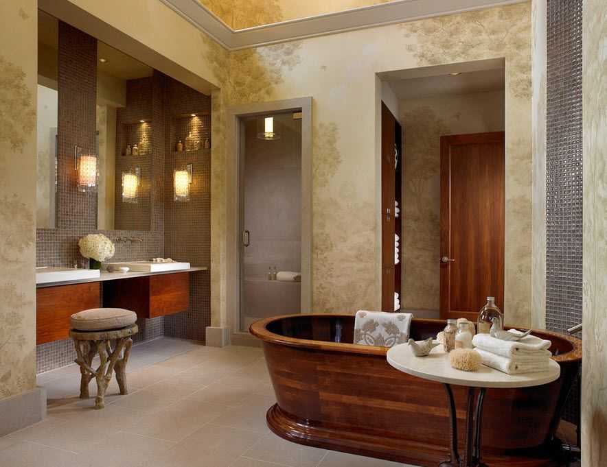 Использование дерева в ванной позволит оформить пространство в ином стиле. Сырье чрезвычайно универсально — оно вписывается в классическое пространство, украшает современные интерьеры и является важным элементом стиля бохо.