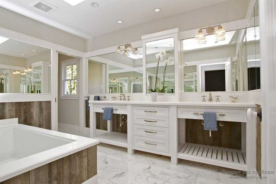 Рядом с ванной обычно устанавливают раковину, подходящую по стилю. Располагают умывальник у стены на высоте около 70 см от пола. Коммуникации скрывают путем установки задвижных панелей или короба с дверцами. Над раковиной размещают зеркало: чем оно больше, тем ванная будет казаться больше.