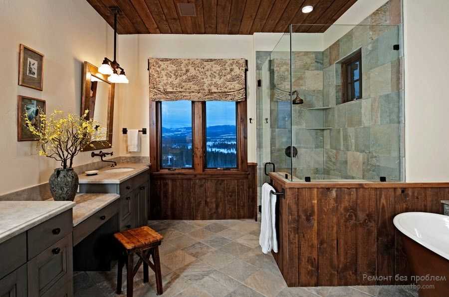 В деревянных домах очень часто можно встретить различные комбинации отделочных материалов, к примеру, дерево и керамическая плитка. Благодаря этому не теряется особый облик деревянного строения, а также достигается высокая практичность – для зон, где возможен контакт с водой, лучше всего, чтобы отделка была произведена кафельной плиткой. Нередко можно встретить подиумы посередине или в углу ванной, которые благодаря плитке становятся недоступными для воздействия влаги.