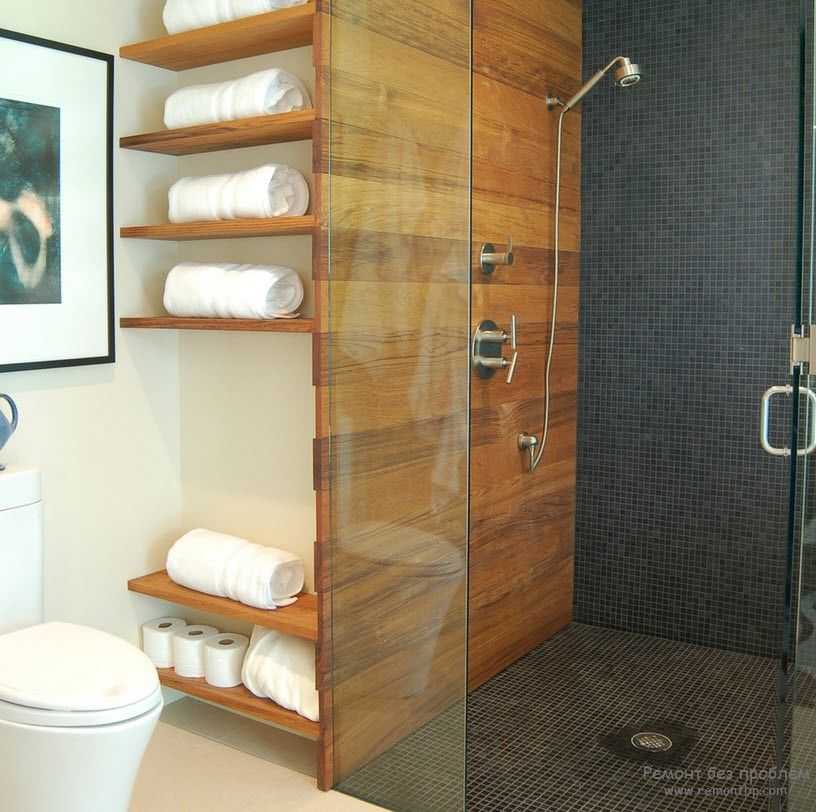 При ограниченной площади следует отказаться от громоздких шкафов. Остановиться на встроенной мебели и настенных полках. В ванной комнате в деревянном доме должны быть крючки и полотенцесушитель.