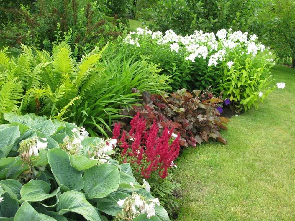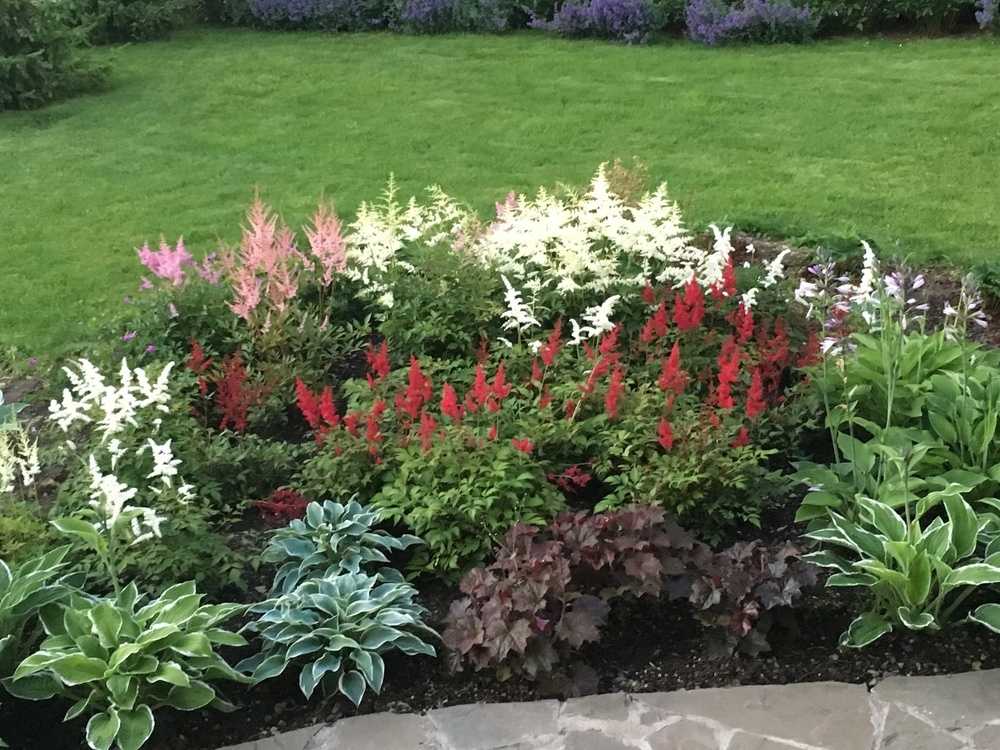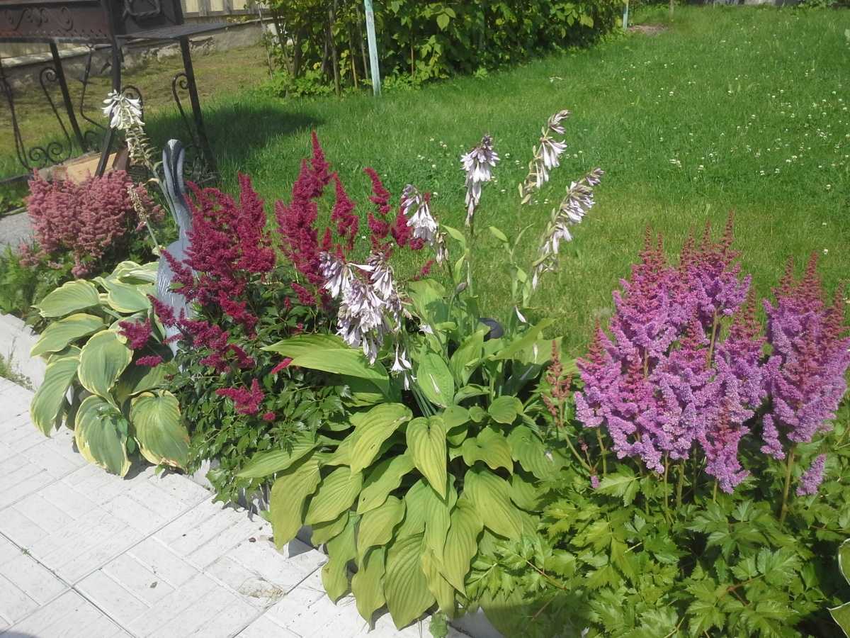 Клумбы с астильбой и хостой очень популярны. Сочетание ярких цветов и зелени выгодно смотрится на любом участке. Такой тандем не дает пробиваться сорнякам.
